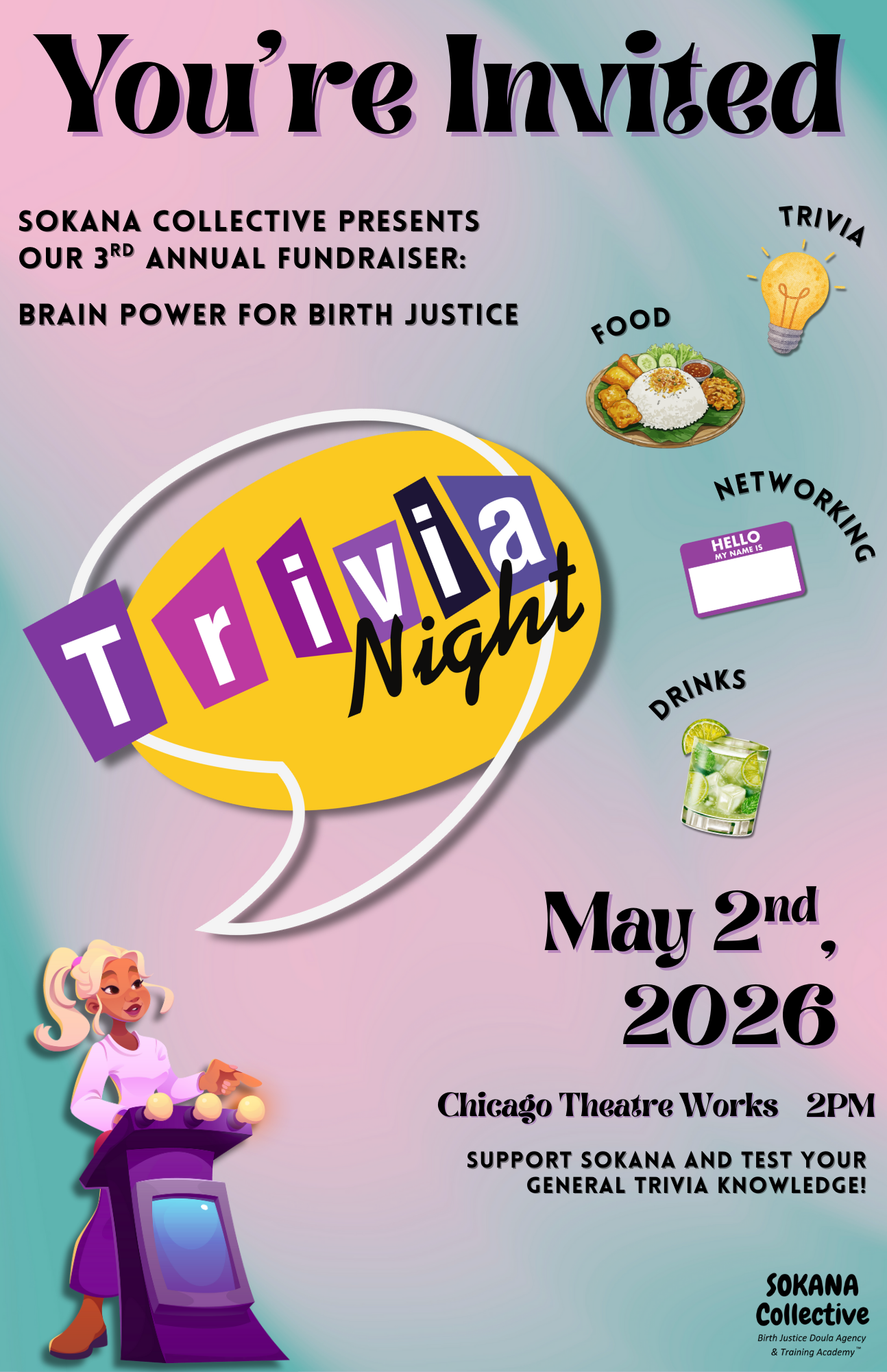 Brain Power for Birth Justice is Sokana Collective’s signature trivia fundraiser. Join us for an afternoon of friendly competition, great food and drinks, and powerful community impact. Hosted by Hambone’s Trivia, this event brings people together to support birth justice and equitable maternal care.